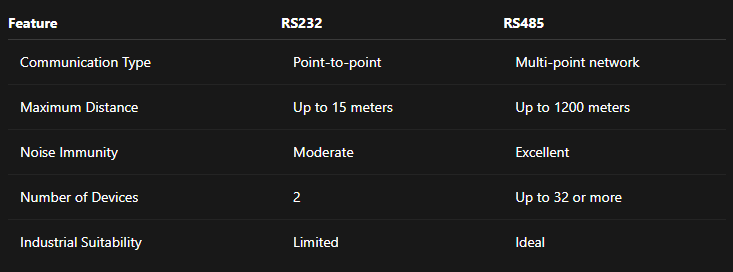 RS485 supports longer distances, multiple devices, and offers superior noise immunity, making it ideal for industrial environments.